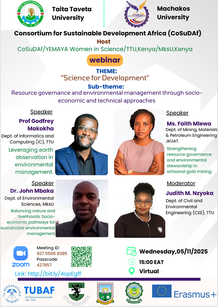 You are invited to join the upcoming CoSuDAf/YEMAYA Women in Science Webinar hosted by TTU, Kenya and Machakos University under the theme: “Science for Development”